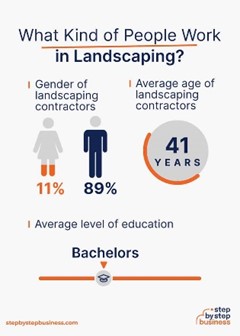 - Average level of education – 44% of landscaping contractors hold a bachelor’s degree and 25% have a high school diploma.
